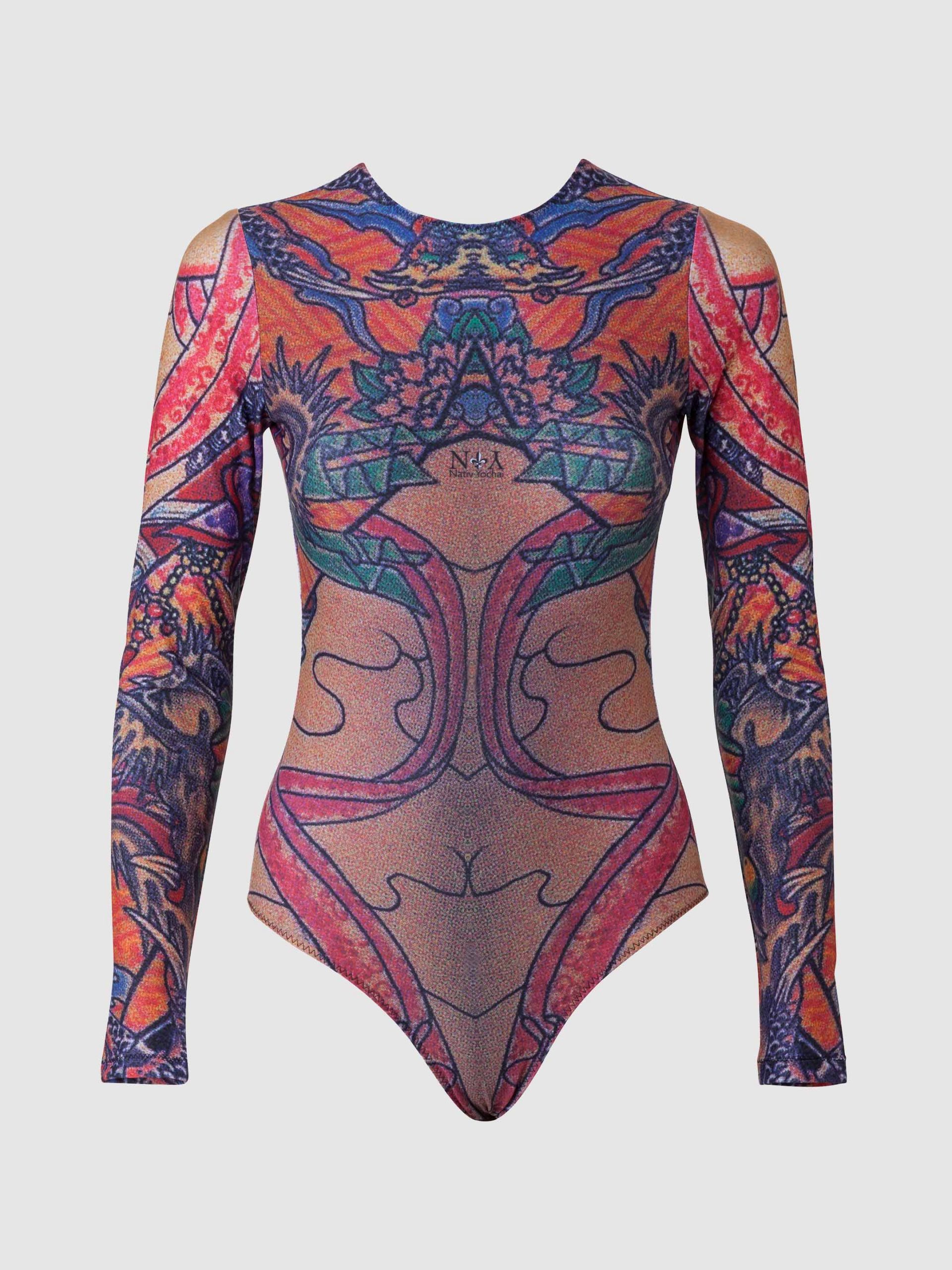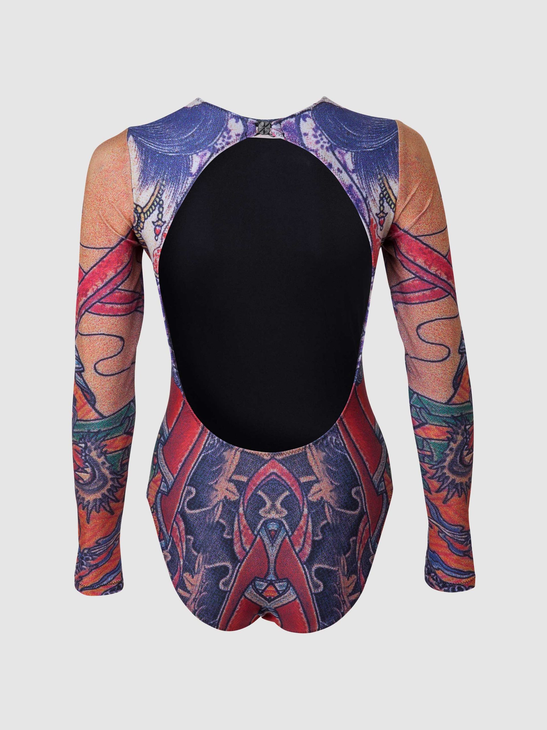 Crew neckline tattoo surf swimsuit with open low scoop back and clasp closure. Brief cut. Body lined. Ideal for smaller bust sizes.