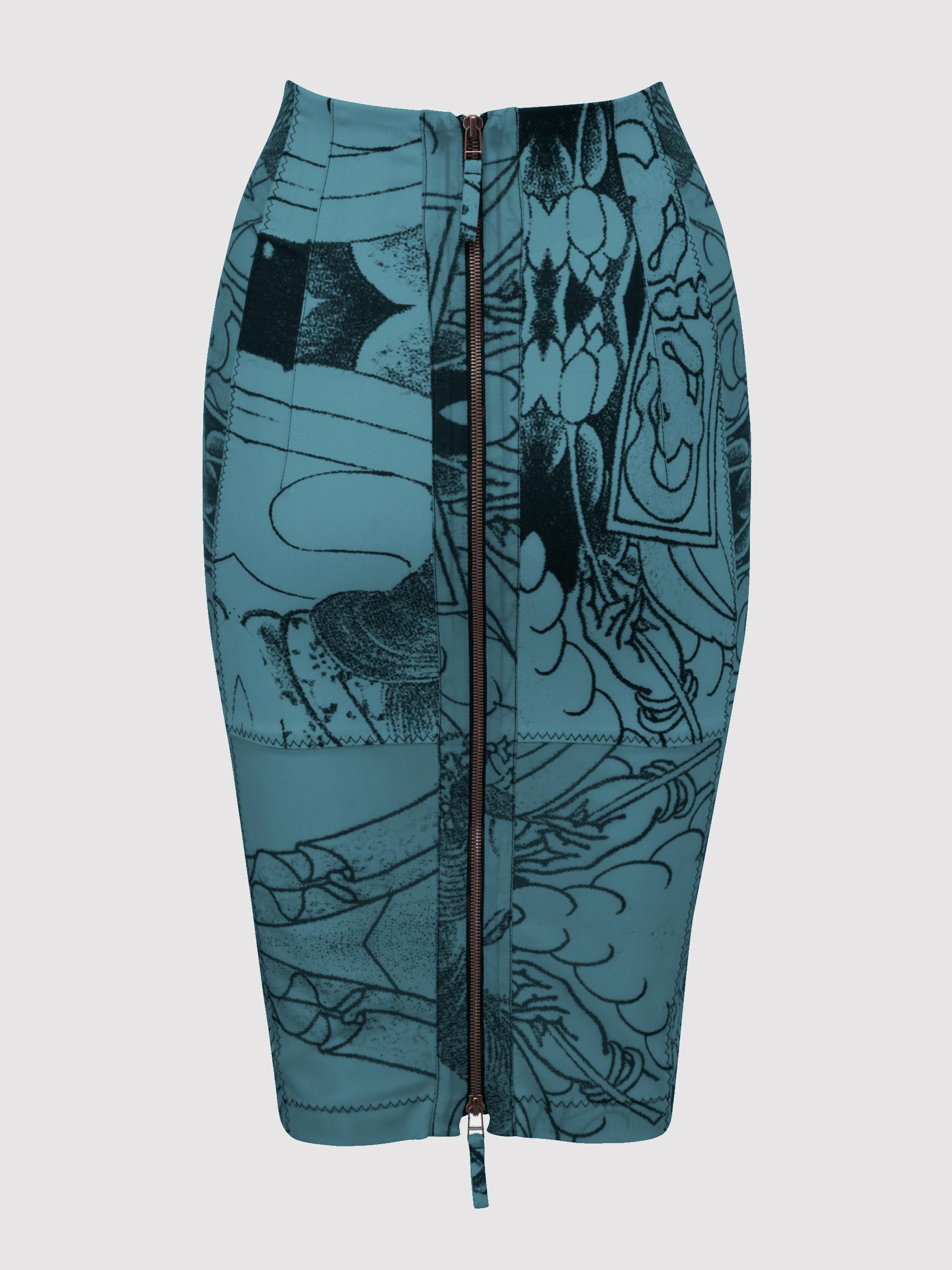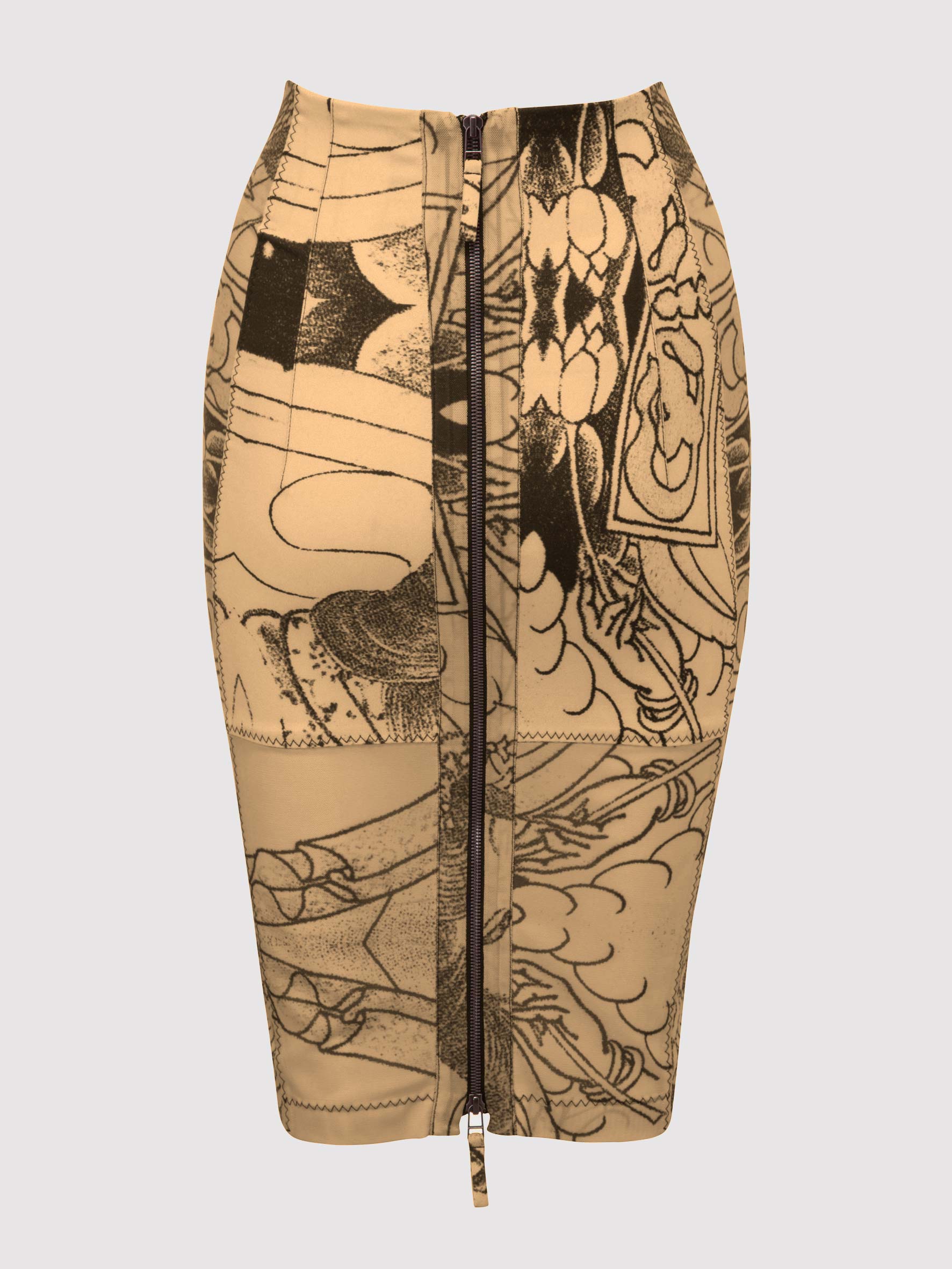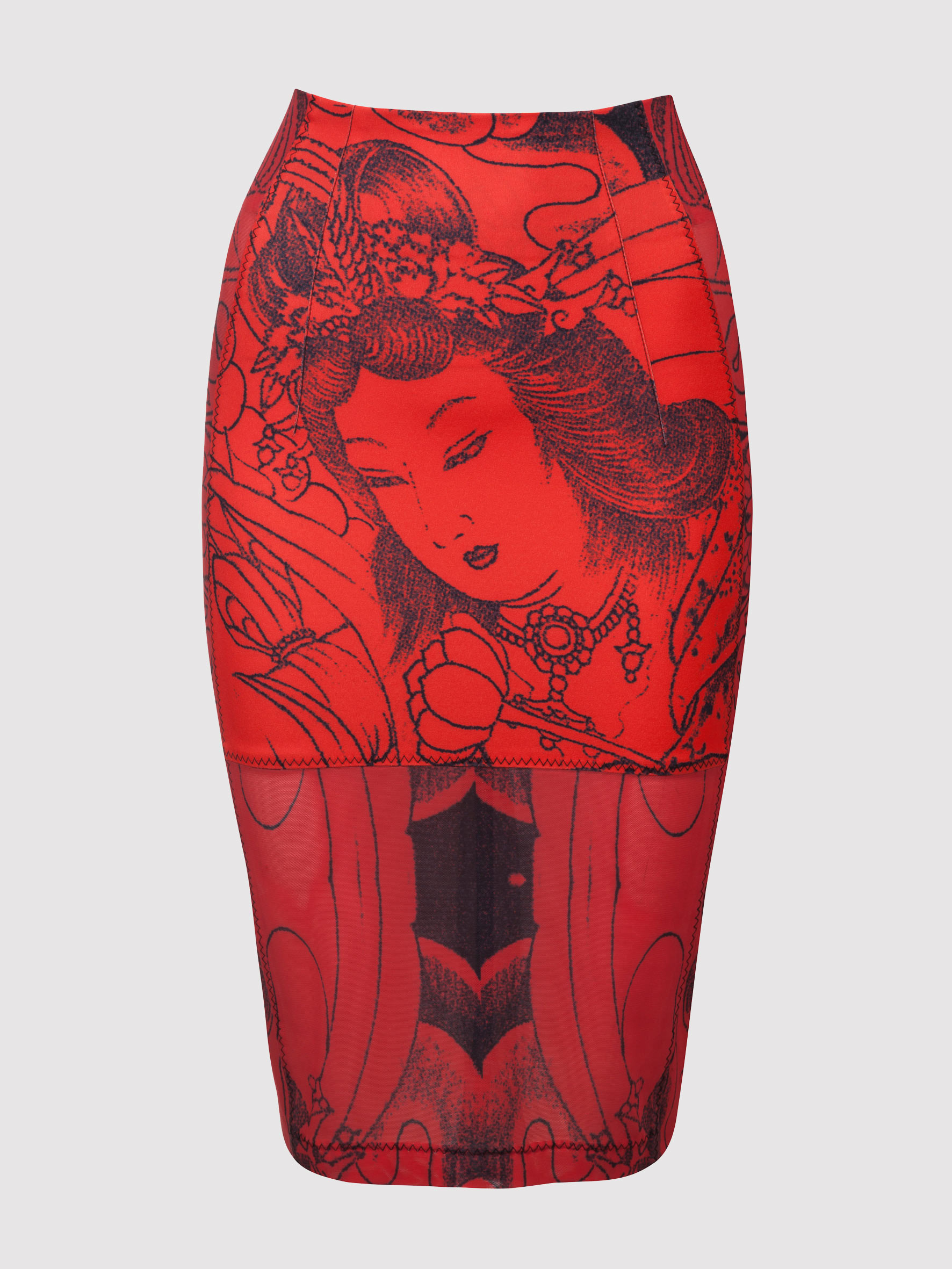 A knee-length pencil skirt with a traditional geisha print and dominant back 2-way zipper, stretching all the way from top to bottom. Incorporating a see-through lower part, this skirt silhouette elongates the legs, giving you a sexy yet strong feminine presence. Ideal for late cocktail event. See-through tattoo inserts at center back and at the sides.