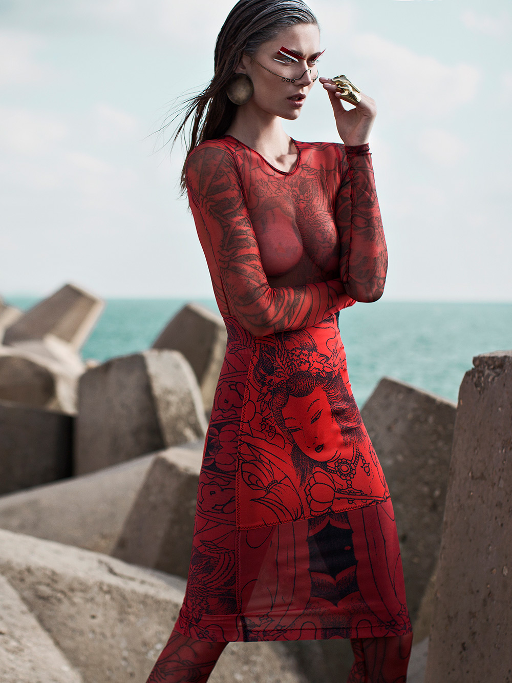 The model measurements are 88-67-96 cm / 34.5-26.5-37.8 in (bust-waist-hips), she is 176 cm – 5’9″ tall, weights 56 kg – 123 lb and wears size S.
