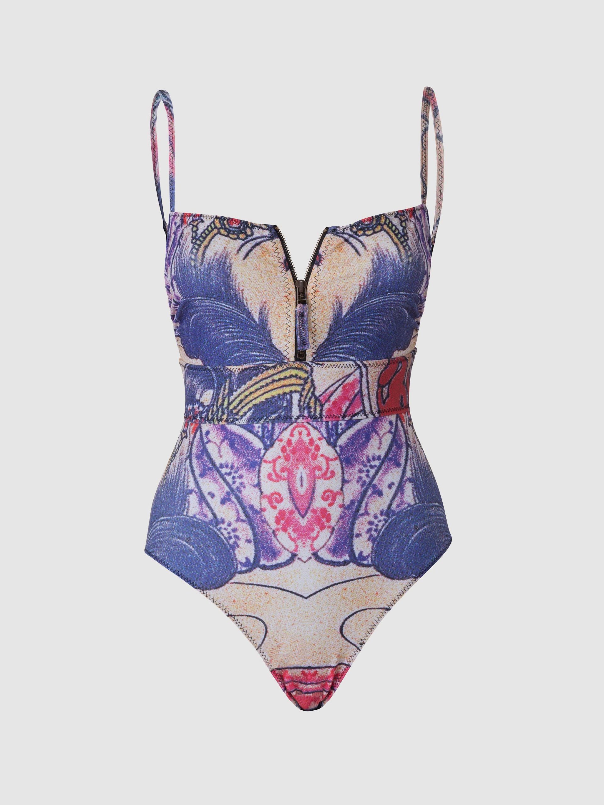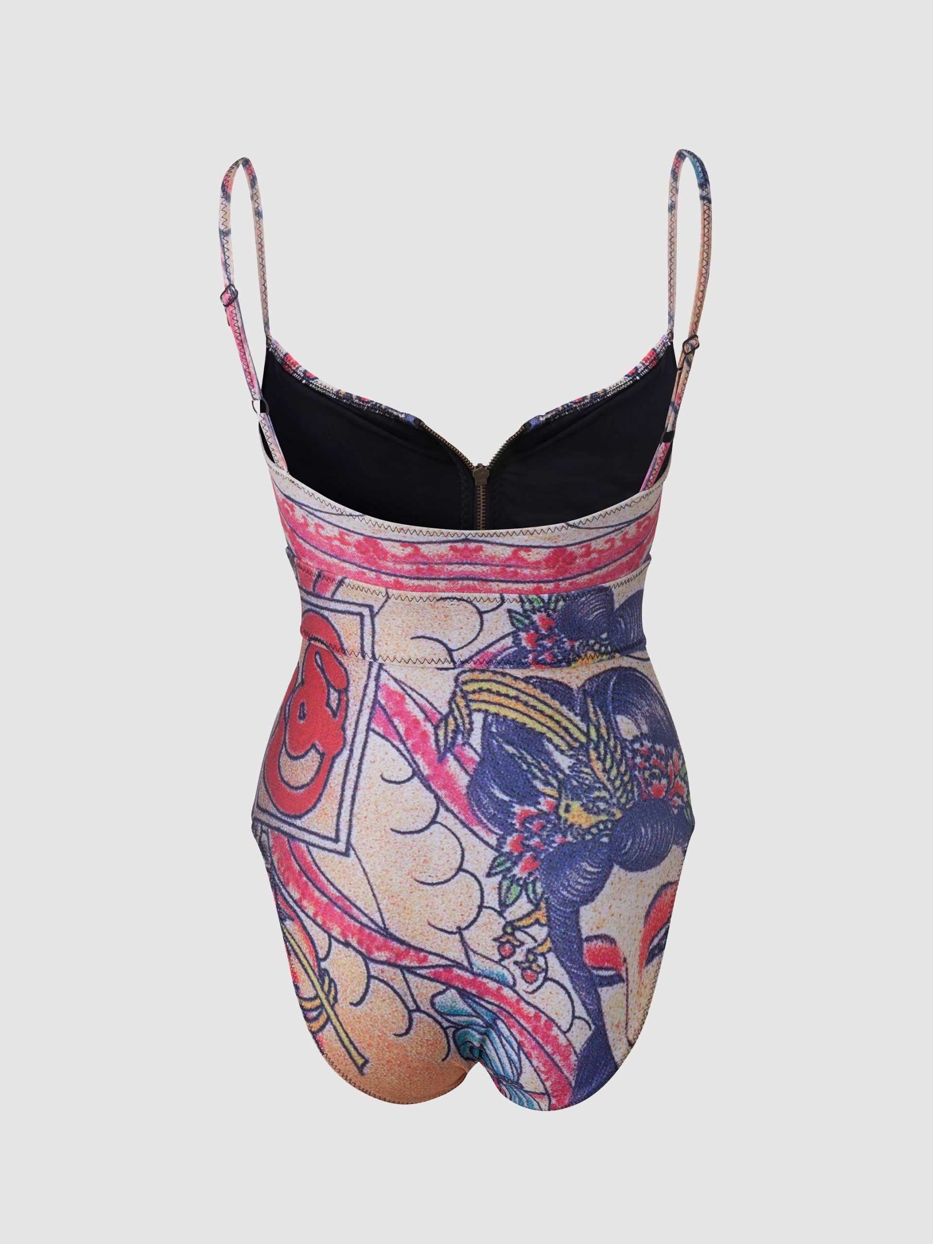 One piece tattoo swimsuit with square neck and front metal zipper. Adjustable straps. Boned sides. Brief cut. Lined. Ideal for fuller bust sizes.
