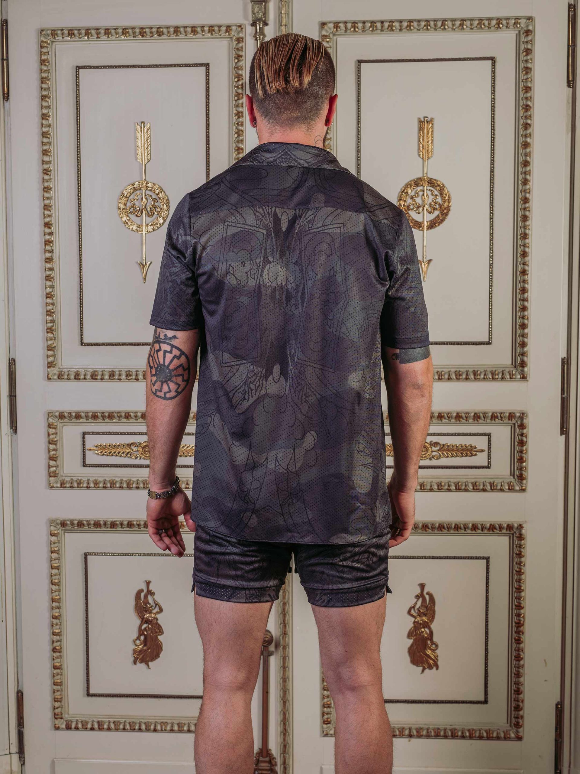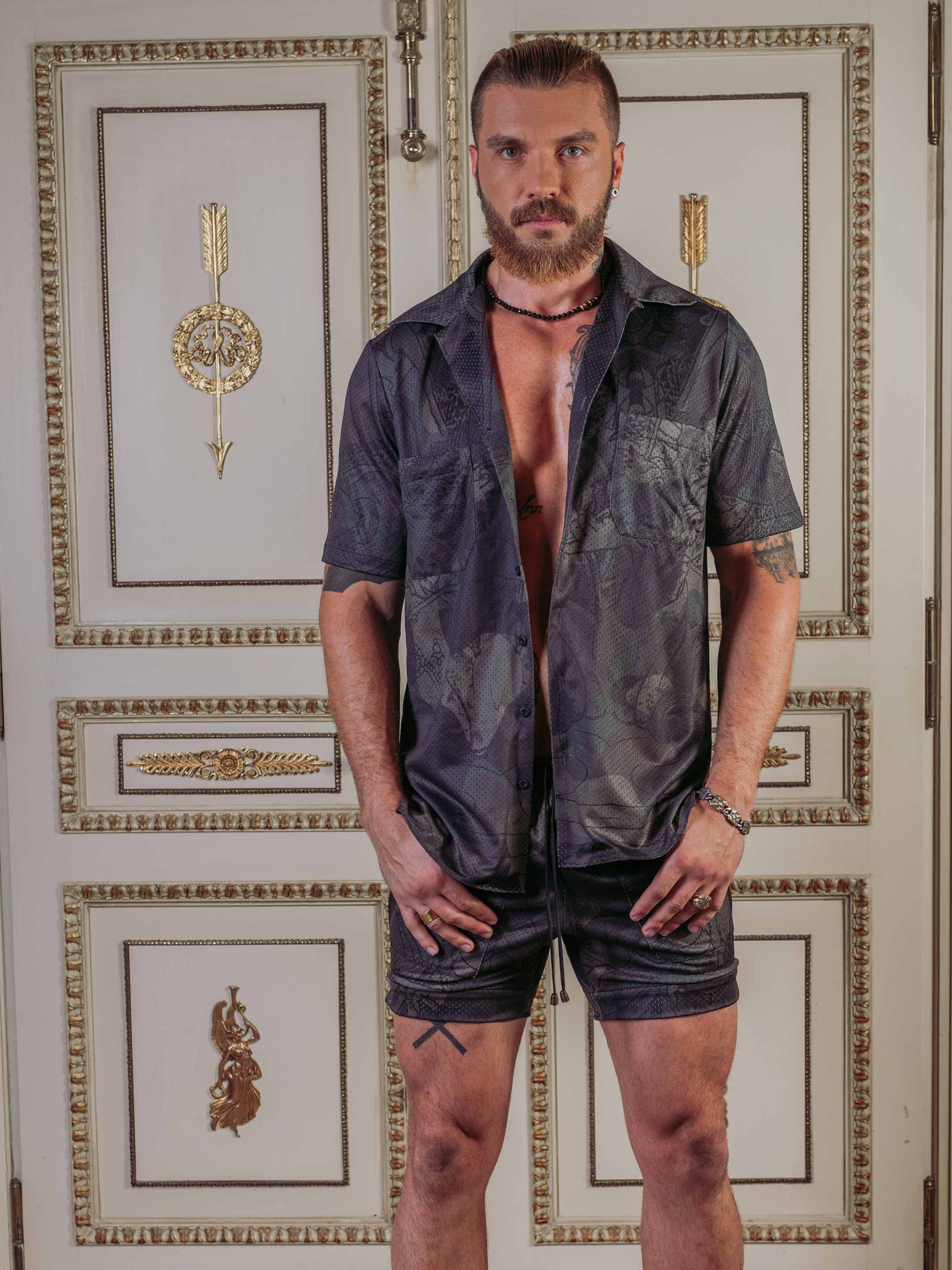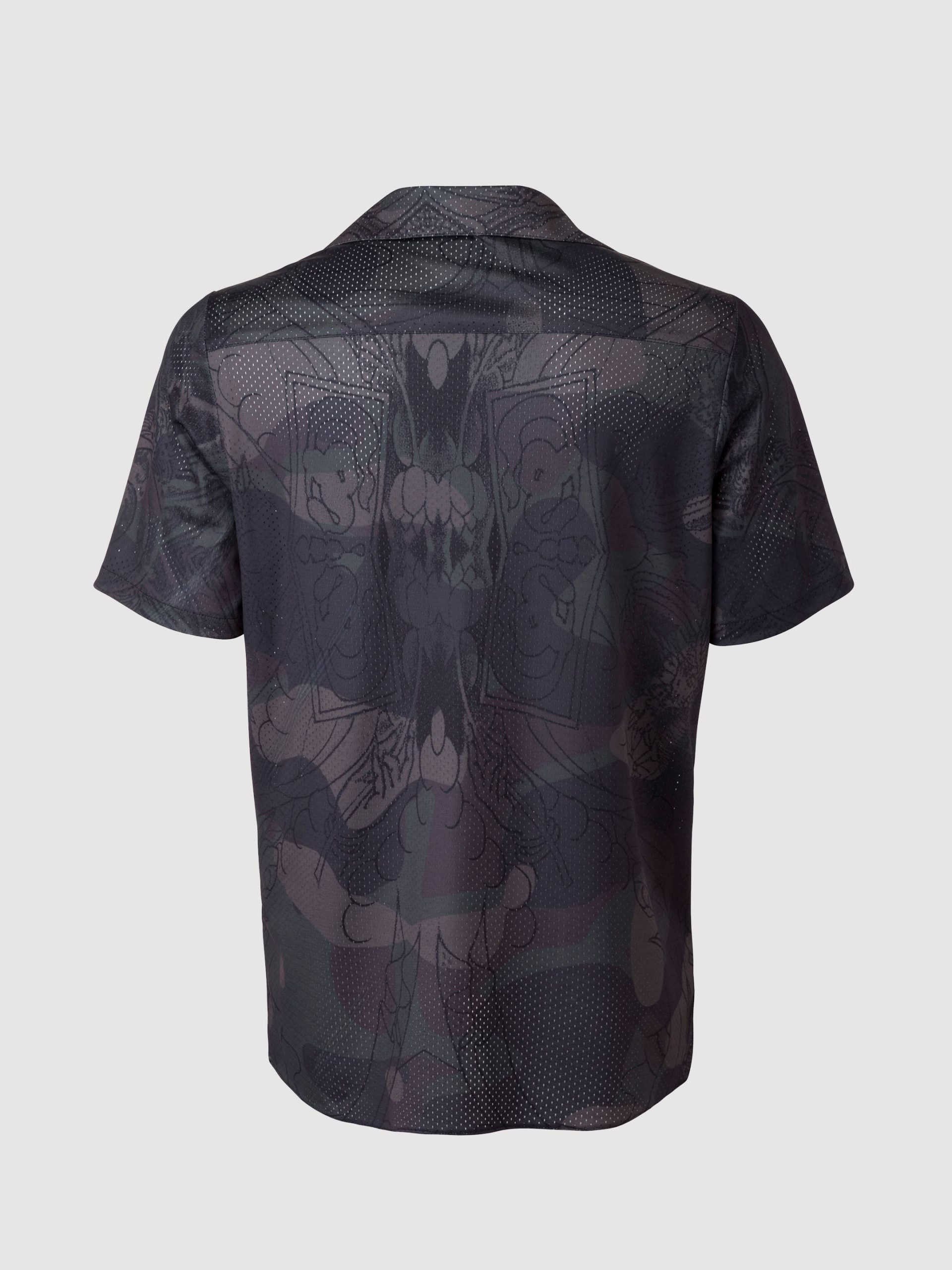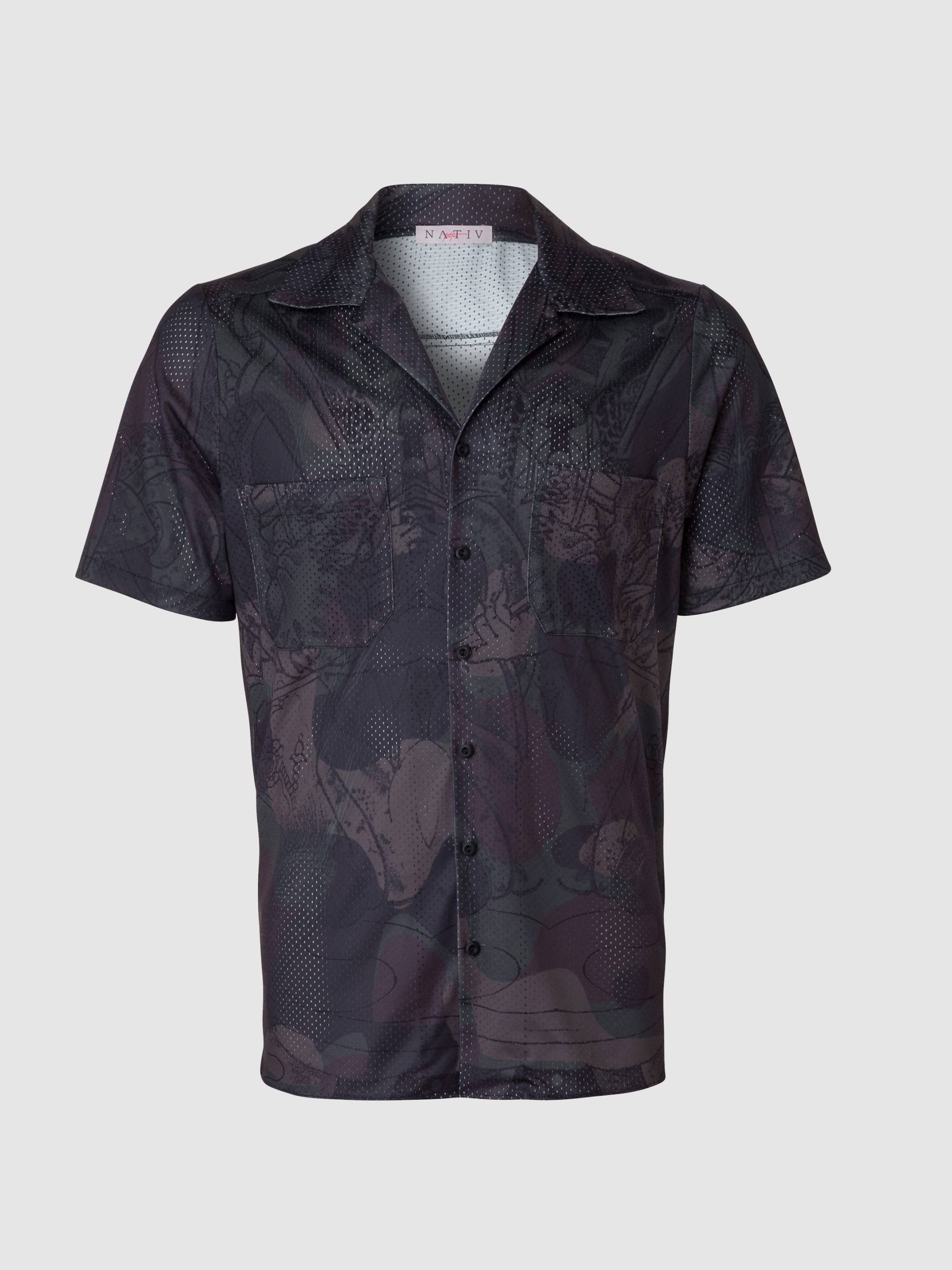 Men perforated tattoo blouse with short sleeves and revere collar. 6 buttons placket. 2 breast patch pockets.